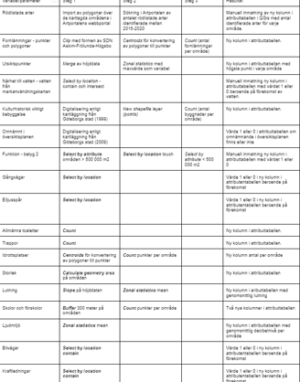 Tabell som visar bearbetningen av data i QGis som låg till grund för klassificering och värdering.