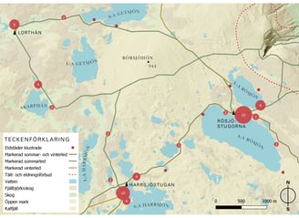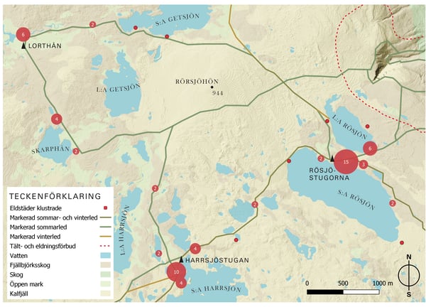 Karta som visar kartlagda eldstäder i området som kluster.